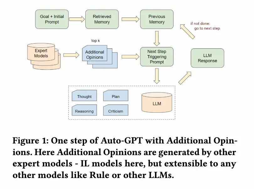 5. 额外意见算法(Additional Opinions algorithm):引入了额外意见算法,这是一种有效的方法,将监督/模仿学习者(supervised/imitation-based learners)纳入Auto-GPT方案。这种方法使得在不需要对基础LLMs进行微调的情况下,进行轻量级的监督学习。