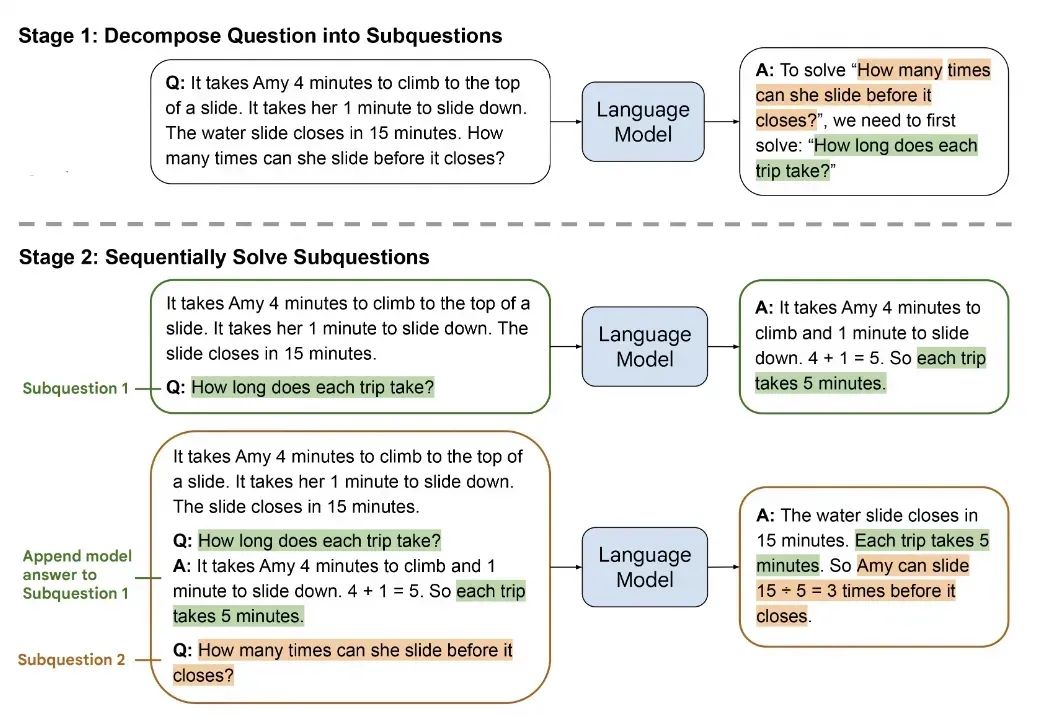 2.Least-to-Most Prompting策略:该策略分为两个阶段:问题分解和子问题解决。在问题分解阶段,使用常量示例展示如何分解问题;在子问题解决阶段,提示包含三个部分:已解决子问题的示例、已回答的子问题及其生成的解决方案列表,以及下一个待解答的问题。