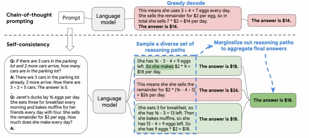 - 一致性:通过对多个路径的最终答案进行边际化(marginalization),自洽性方法能够识别出最一致的答案,这通常更可能是正确的答案。