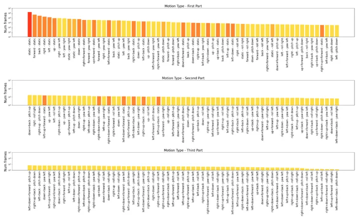 标签分布。Translation (平移) 和 Rotation (旋转) 组合的分布如图所示。不同的标记模式由黄色阴影表示,范围从深到浅:静态、仅平移、仅旋转以及平移和旋转。