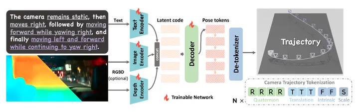 我们的自回归生成模型。 我们的模型支持多模态输入,并根据这些输入生成轨迹。通过将任务视为自回归的 next-token 预测问题,该模型按顺序生成轨迹,每个新姿势预测都受先前相机状态和输入条件的影响。