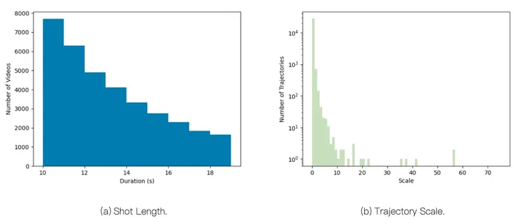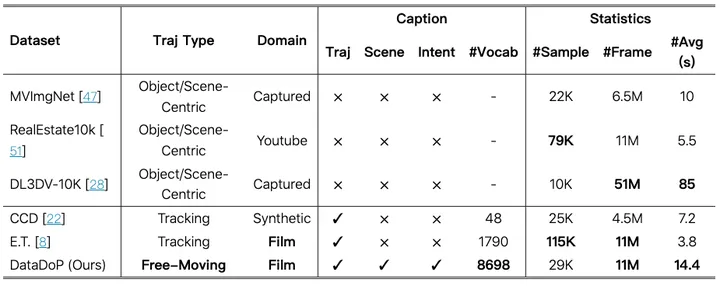 DataDoP 数据集。 与其他数据集进行了比较。DataDoP 是一个大型数据集,专注于艺术性、自由移动的轨迹,每个轨迹都附有高质量的字幕注释。提供的字幕详细介绍了摄像机移动、它们与场景内容的交互以及潜在的导演意图。为了捕捉更复杂的摄像机运动,每个视频剪辑时长为 10-20 秒,平均为 14.4 秒。