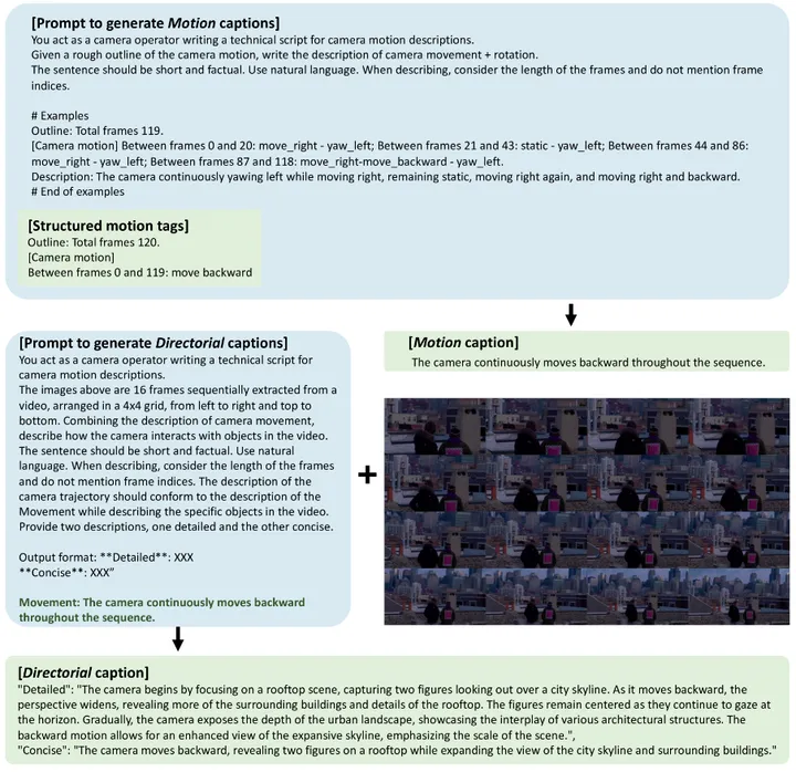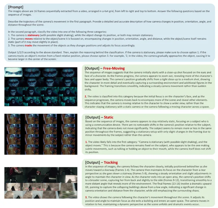 字幕生成。我们通过结合上下文、指令、约束和示例来构建运动标签,然后利用 GPT-4o 生成单独描述相机运动的运动字幕。接下来,我们从镜头中提取 16 个均匀分布的帧,创建一个 4×444\times 44 × 4 网格,促使 GPT-4o 同时考虑前面的标题和图像序列。