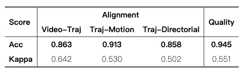 文本对齐:DataDoP 数据集在文本对齐方面表现优异,其 CLaTr-CLIP 分数达到了 0.400,显著高于其他现有方法。