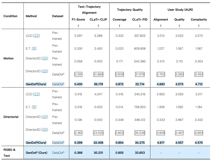 定量结果。我们展示了我们的 GenDoP 在两个文本条件生成任务和一个 RGBD 和文本条件任务中的定量结果,将其与人类跟踪方法 CCD [22]和 E.T. [8]以及以对象/场景为中心的方法 Director3D [26]进行比较。我们的模型在所有指标和标题子集中始终优于所有基线,证实了我们的数据集和自回归框架的有效性。