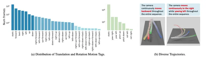 (a) 数据集统计和 (b) 多样的轨迹。a说明了 27 个平移运动(左)和 7 个旋转运动(右)的组成和分布,强调了 DataDoP 数据集中轨迹的复杂性和多样性. b基于相同的标题,我们的数据集包括仍然符合给定标题的不同轨迹。如图所示,轨迹在长度、方向和速度方面表现出变化,有效地展示了我们数据集中的多样