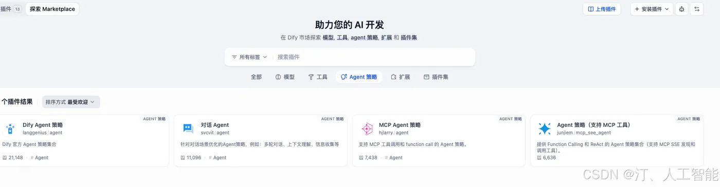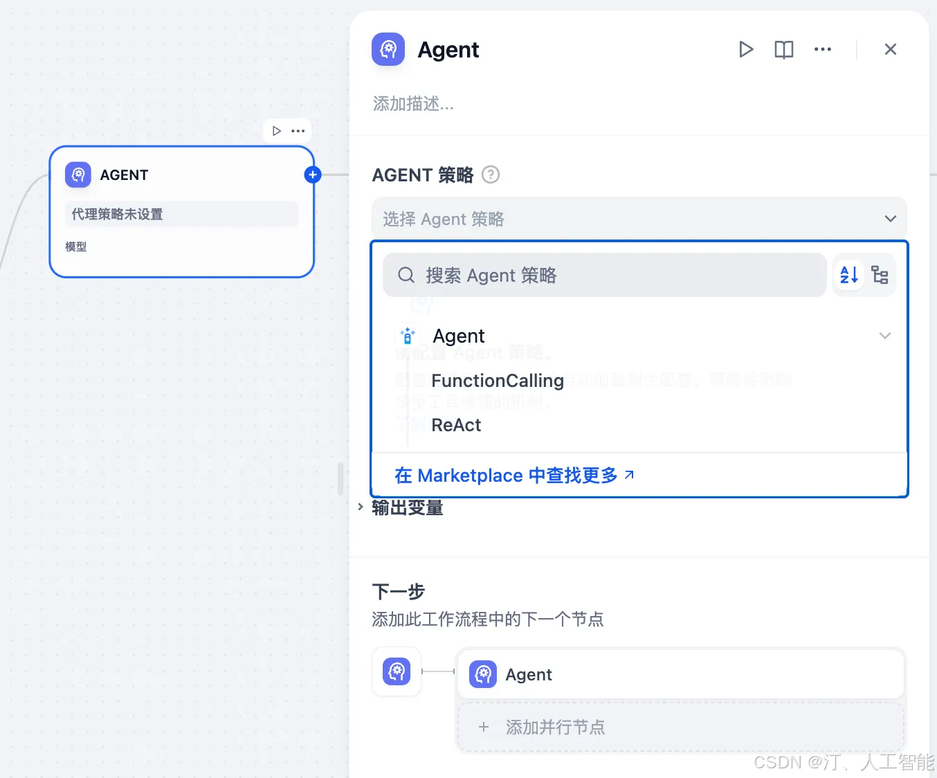 从下拉菜单选择所需的 Agent 推理策略。Dify 内置了 Function Calling 和 ReAct 两种策略,可在 Marketplace → Agent 策略分类中安装使用。