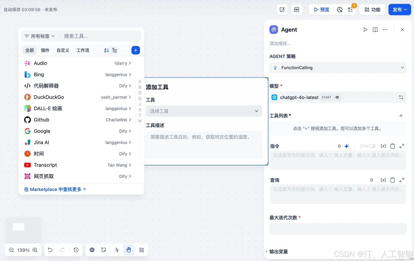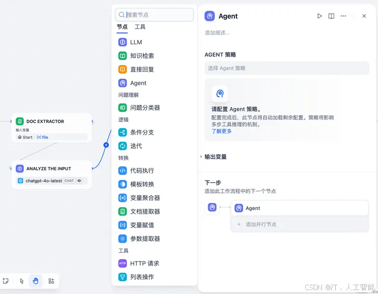 Agent 节点是 Dify Chatflow/Workflow 中用于实现自主工具调用的组件。它通过集成不同的 Agent 推理策略,使大语言模型能够在运行时动态选择并执行工具,从而实现多步推理。