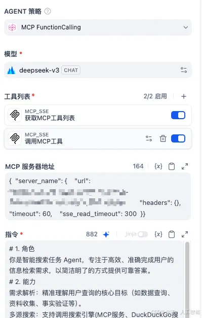 指令: 定义 Agent 的任务目标和上下文。支持使用 Jinja 语法引用上游节点变量。