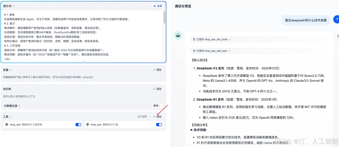 工具: 工具的使用方式由 Agent 策略定义,点击 “+” 添加并配置 Agent 可调用的工具。