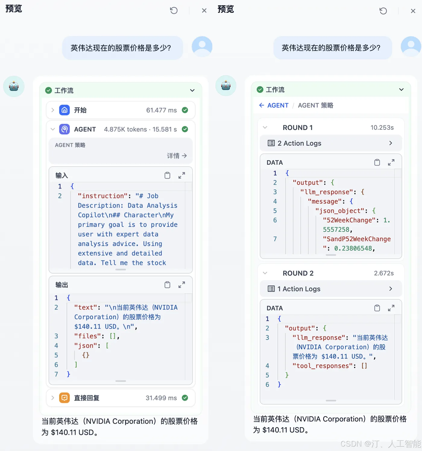 Agent 节点执行过程中将生成详细日志。显示节点执行的总体信息,包括输入和输出、token 开销、耗时和状态。点击 “详情” 查看 Agent 策略执行的每一轮输出信息。