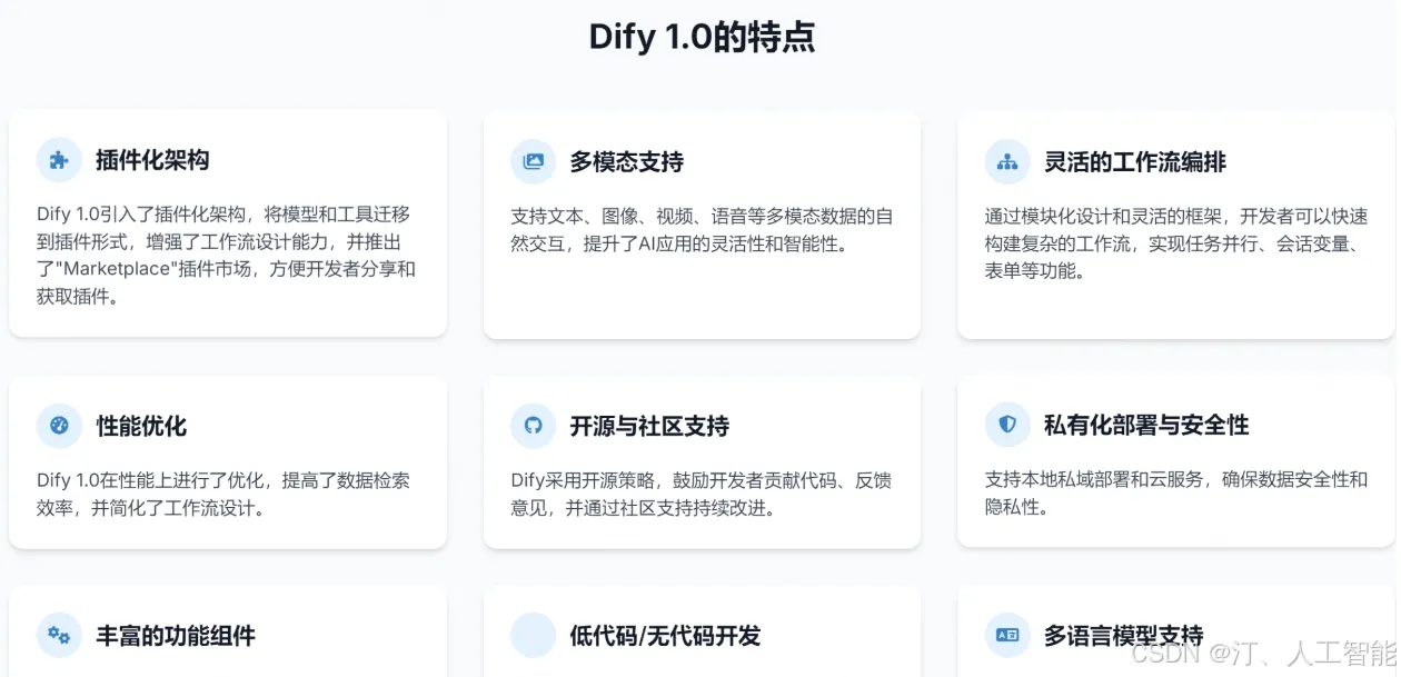 Dify 是一款开源的大语言模型(LLM)应用开发平台,旨在简化生成式 AI 应用的开发、集成和部署过程。它结合了后端即服务(Backend as a Service)和 LLMOps 的理念,为开发者提供了一个直观、模块化且功能丰富的开发环境,使非技术人员也能轻松参与 AI 应用的定义和数据运营过程。