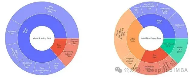 视频微调阶段维持了14%的文本数据比例和33%的视频内容以实现最优性能平衡。视频数据方面,视觉描述和字幕内容取样自LLaVA-video-178k、Video-STAR、Vript和ShareGPT4Video等数据集。时间理解任务数据来自Vista-400k,叙事理解能力则主要通过MovieChat和FineVideo数据集培养。多图像处理数据从M4-Instruct和Mammoth数据集中采样获得。