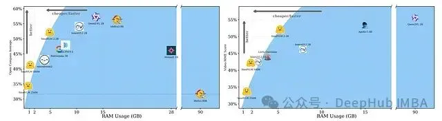 - 计算效率与内存优化:与大型模型相比,SmolVLM系列展示出显著的计算效率和更低的内存占用。例如,SmolVLM-256M在单图像推理任务中仅需0.8GB VRAM,而同类任务下MolmoE-A1B-7B则需要27.7GB内存资源。