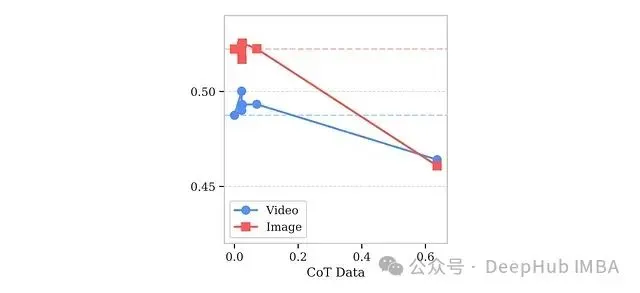 - 纳入极少量(0.02-0.05%)的CoT示例能略微改善模型性能,但更高比例的CoT数据会显著降低整体效果,尤其是在图像相关任务中。