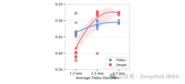 增加训练阶段的视频时长能提供更丰富的时间上下文信息,但同时也增加了计算资源需求。为确定最佳视频时长,研究团队在平均视频长度从1.5分钟到3.5分钟不等的条件下训练了多个SmolVLM变体。