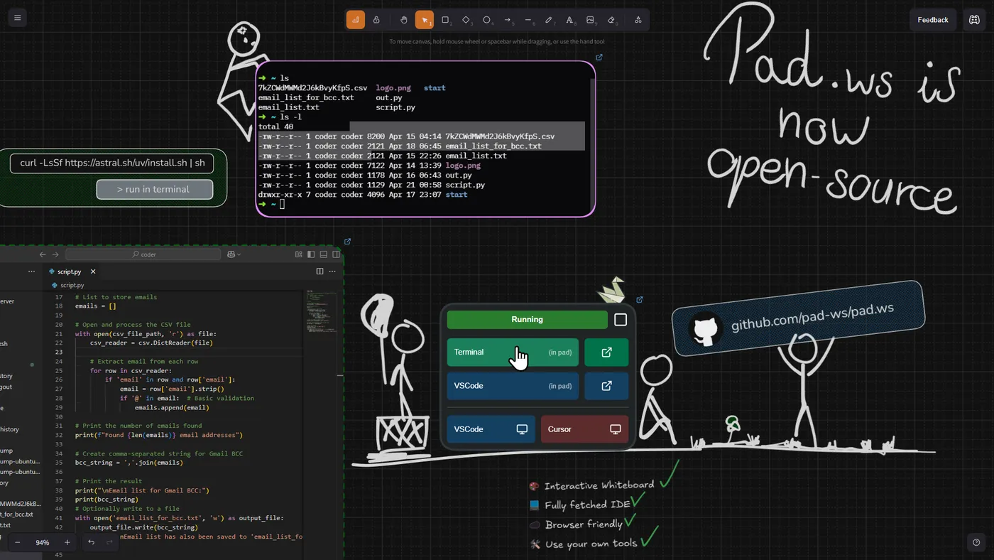 pad.ws 是一个可以在浏览器中作为开发环境使用的白板应用。此应用使用 Excalidraw 作为白板界面,Coder 作为云开发环境。