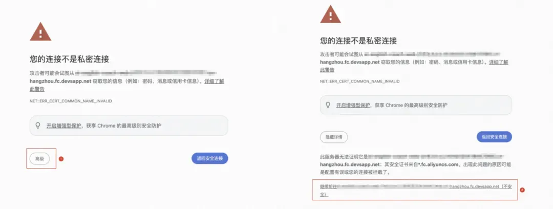 2. 点击访问地址,在浏览器中,会自动跳转为 HTTPS 链接地址。提示安全证书警告或错误,可以选择点击高级选项,然后点击继续前往以访问该网站。