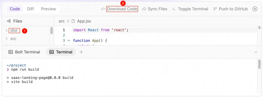 2. 待命令执行完成后,左侧的Files中会新增一个名为dist的文件夹。之后点击上方的Download Code下载代码压缩文件。