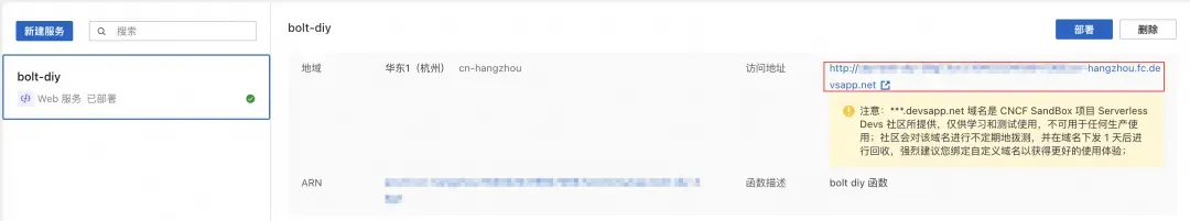 说明:当前测试域名由 Serverless Devs 社区所提供,仅供学习和测试使用,不可用于任何生产使用,域名有效期为 1 天,如果需要用于生产环境建议配置自定义域名,详细配置方式请参考:配置自定义域名[8]。