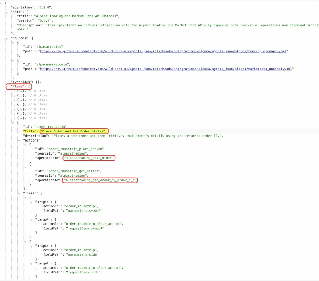 为此,agents.json 引入了flows和links的概念。flows定义的是一个或多个 API 调用顺序,可以看成是一个预设好的复杂的操作。links描述了两个动作是如何连接在一起的。