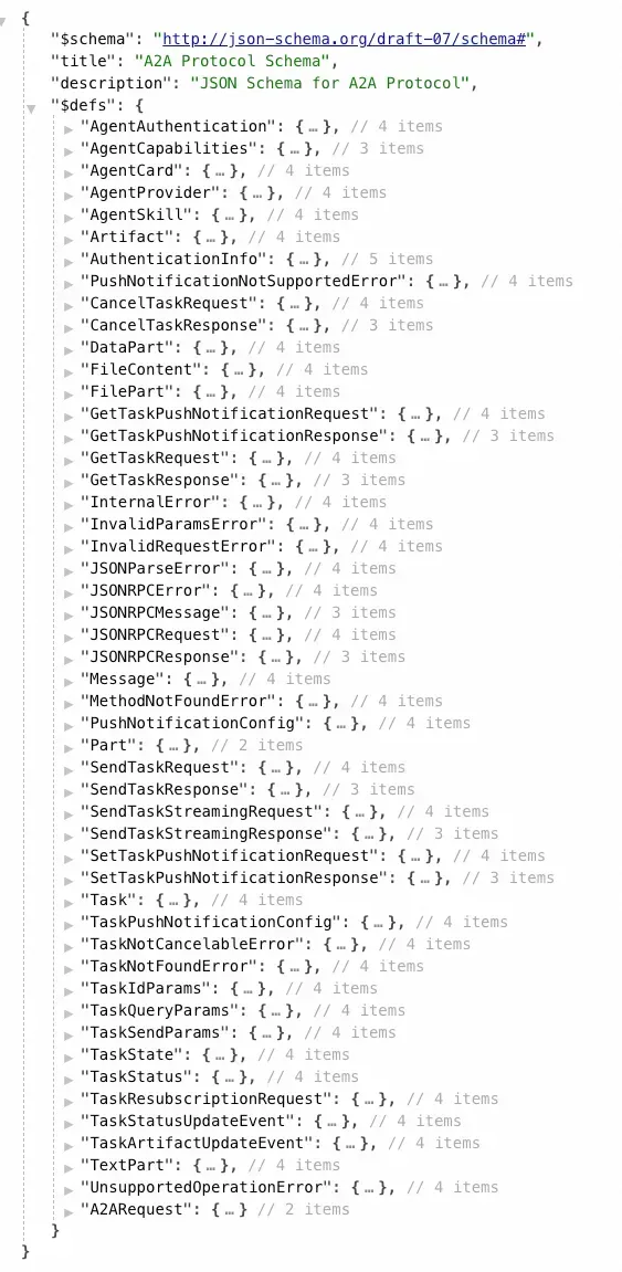 谷歌 A2A 协议的 agent.json 定义:https://github.com/google/A2A/blob/0ad9630e044d72c22428f129165fe4c0de385902/specification/json/a2a.json