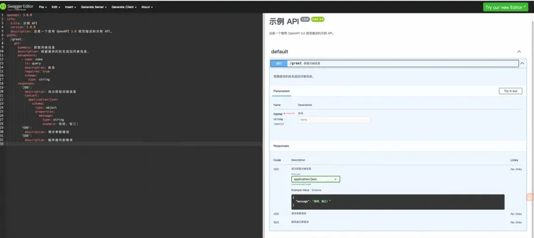 将这份配置放到 https://editor.swagger.io/上,可以很容易且界面友好的看到这个接口的描述,这个就是 OpenAPI 规范。