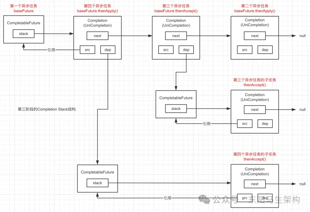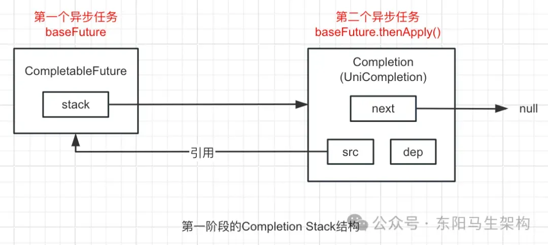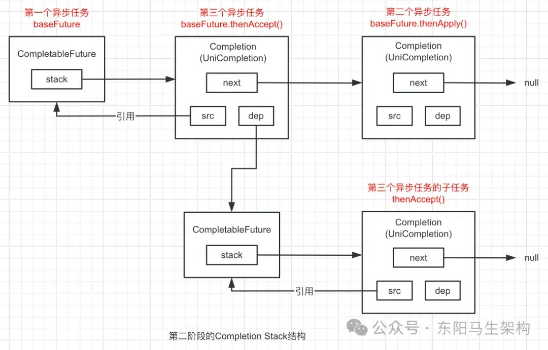 首先使用baseFuture.thenAccept()方法在baseFuture上增加一个回调,此时会把这个回调对应的Completion压入baseFuture的stack的栈顶。