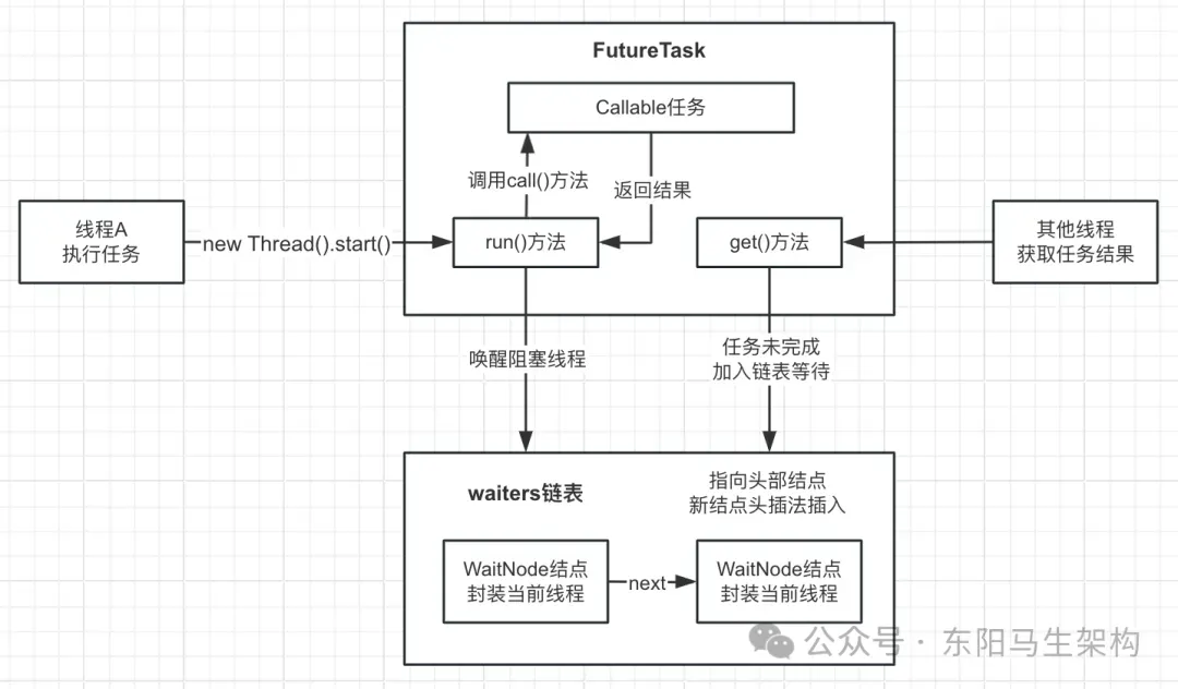 在Callable接口的call()方法没有返回结果之前,其他线程调用FutureTask的get()方法获取结果时,FutureTask会构建一个waiters链表,把当前线程存储到链表中并通过LockSupport进行阻塞,直到call()方法返回后把结果设置到outcome属性以及唤醒阻塞的线程。