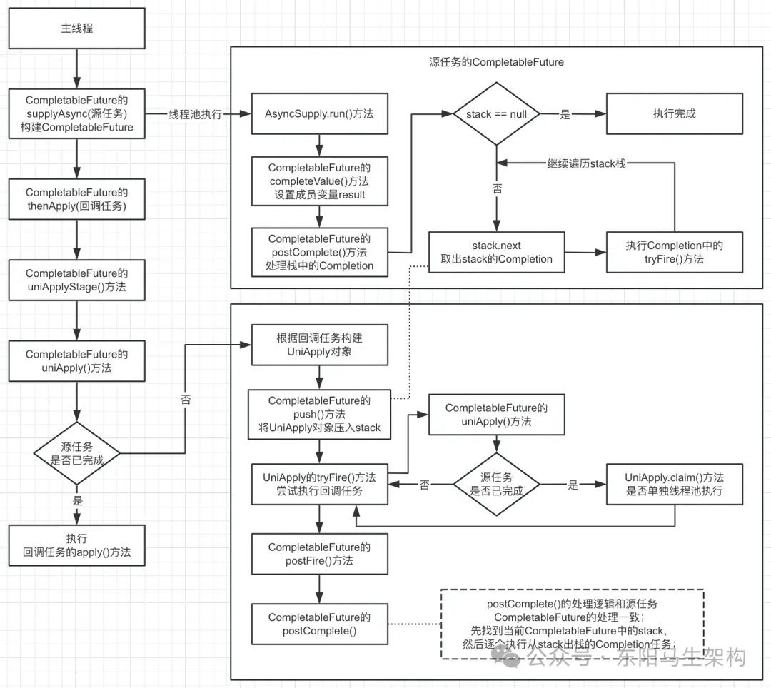 源任务还没执行完成的处理过程具体如下:首先把回调任务封装成一个UniApply对象,然后调用CompletableFuture的push()方法,把UniApply对象压入源任务所在CompletableFuture对象中的stack的栈顶,最后调用UniApply的tryFire()方法来尝试执行该回调任务。