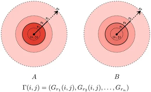 基于矩阵间局部自相似性原理。如果矩阵 A 和 B 之间,基因组 bin_i 和 j 的相互作用接触频率存在显著差异,那么这种差异在该相互作用周围的像素(即“影响半径”)内仍会显著。为了降低远离测试相互作用的相互作用的影响,会以 i, j 为中心,对影响半径施加一个逐渐增大的高斯滤波器。同时,由于基因组位点的线性邻近性和布朗运动,大多数相互作用发生在矩阵对角线附近,因此会根据与对角线的接近程度对相互作用进行归一化处理。最终,每个相互作用用一组向量表示,这些向量包含其邻近相互作用在不同影响半径下的频率,而这组向量的一阶导数将用于检测矩阵 A 和 B 之间的差异。