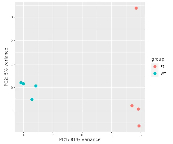 接下来,可以构建DESEQ数据集,并比较“ WT”和“ FS”条件之间的差异loop: