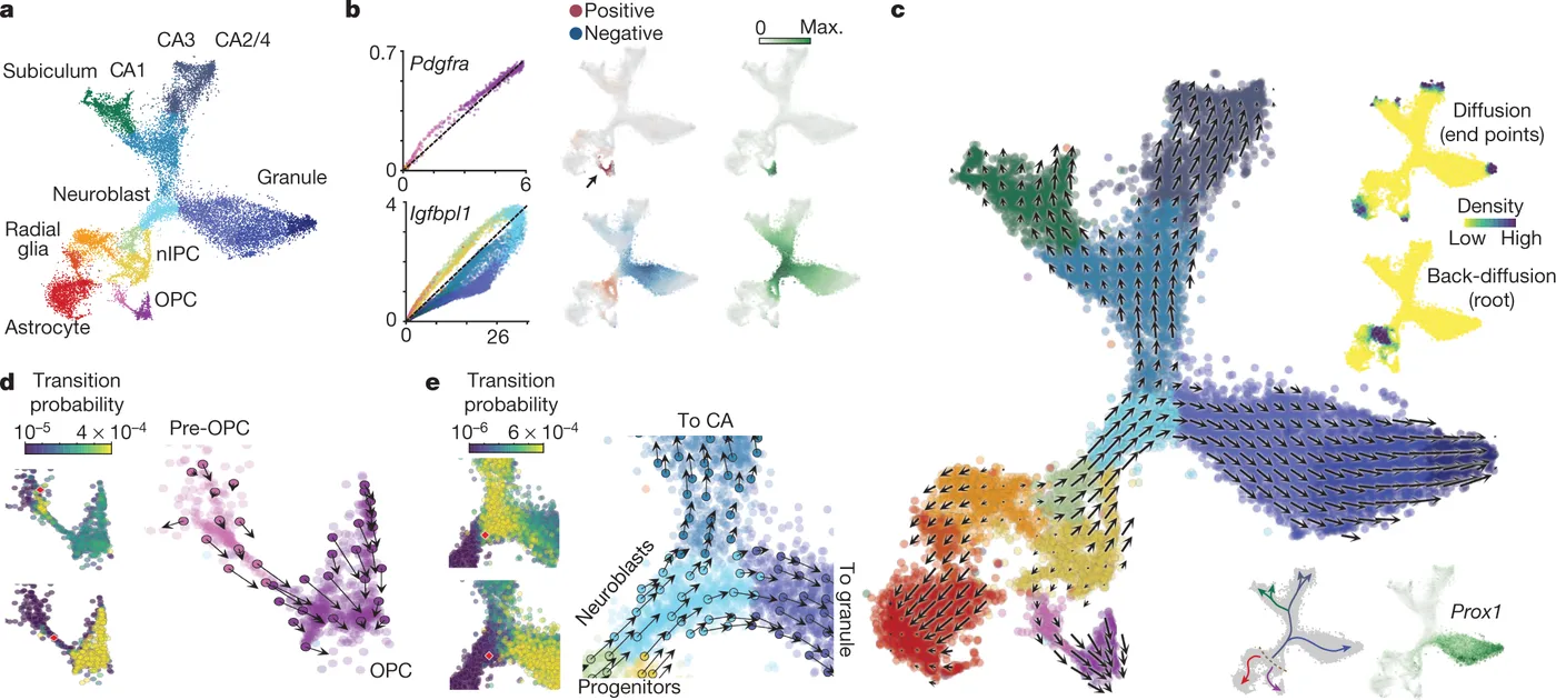 RNA 速率通过将测量值与底层 mRNA 剪接动力学联系起来,探索方向性轨迹的推断。具体来说,当某个基因开始转录时,新转录的前体未剪接 mRNA 会增加;而当转录被抑制或停止时,未剪接 mRNA 会减少。因此,通过区分未剪接和剪接 mRNA,可以近似 mRNA 丰度的变化(即 RNA 速率)。然后,利用跨 mRNA 的速率组合,就可以估计单个细胞的未来状态。