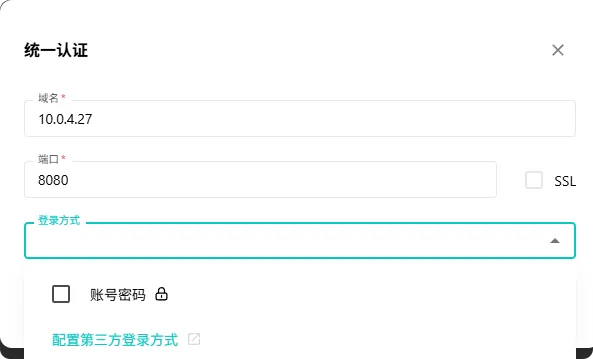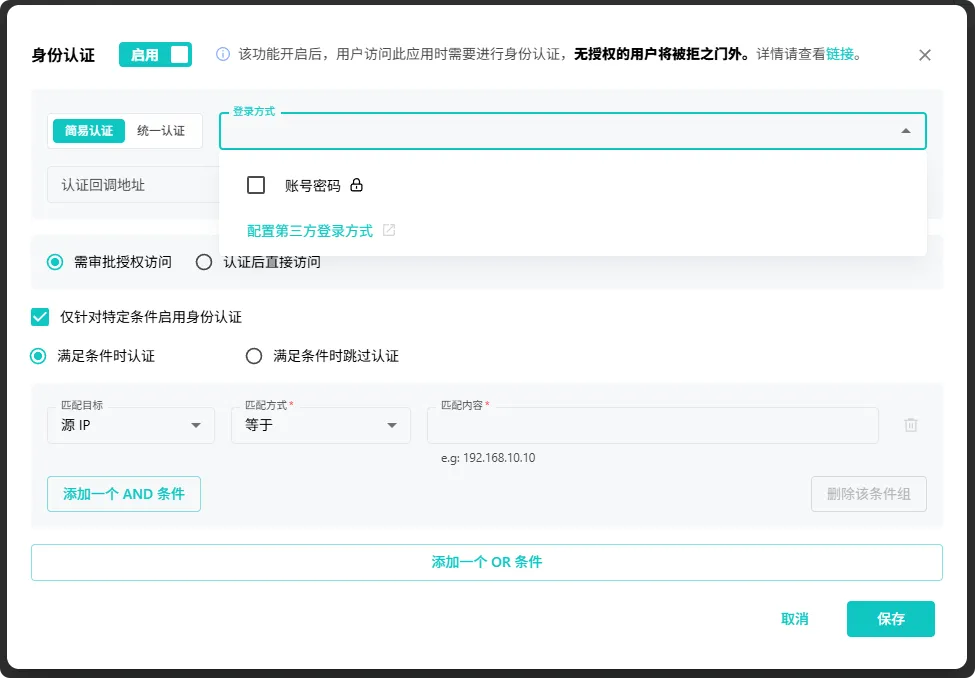 简易认证在登录方式中可选择账号密码、第三方登录,保存后即可