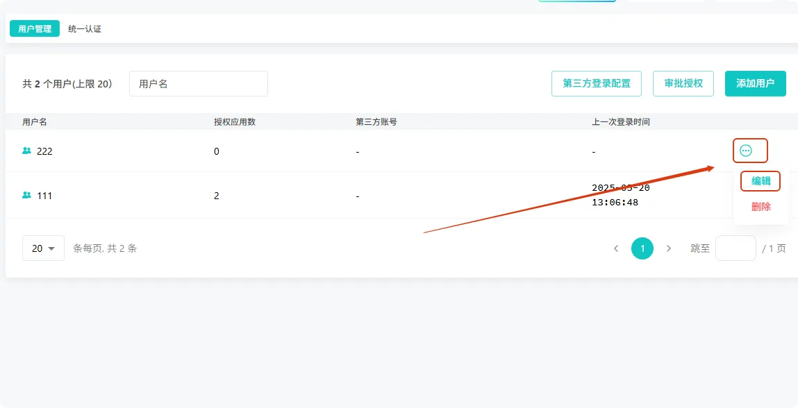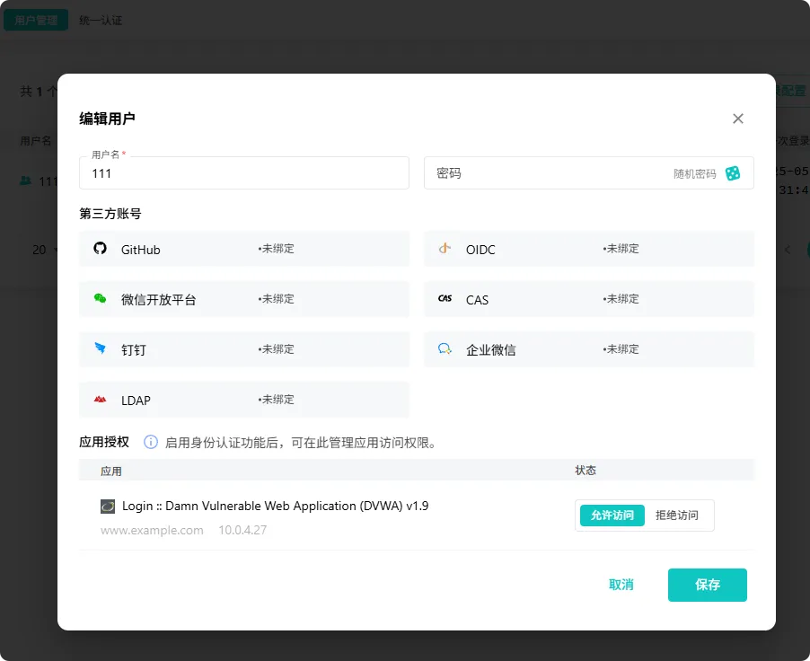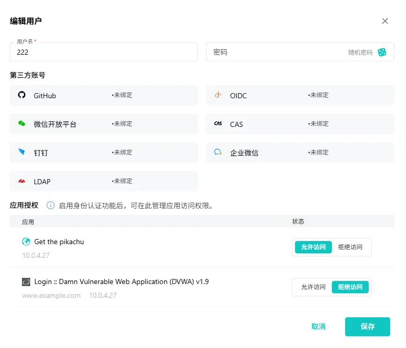 创建完成后,在用户编辑中,可为用户分配应用权限