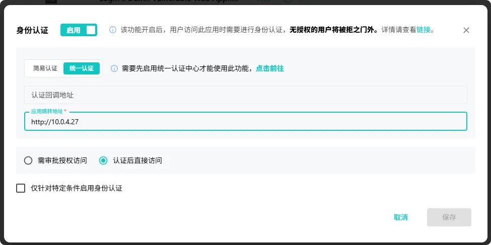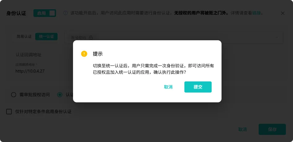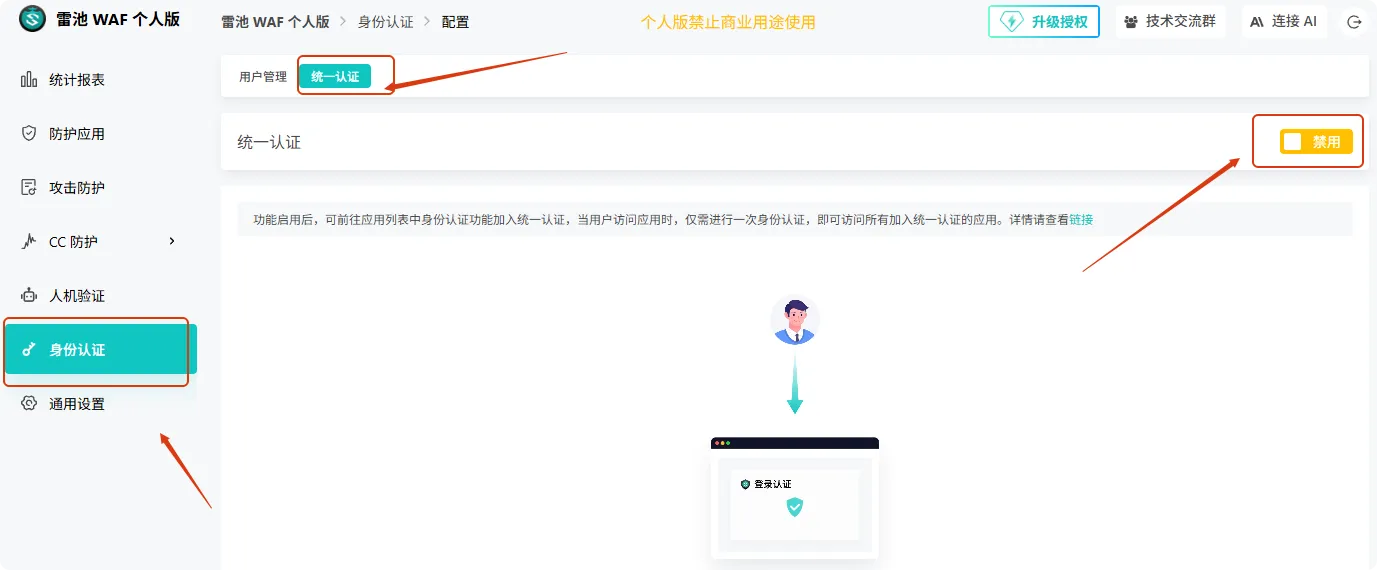 统一认证是要先登陆后,即可访问权限内所有网址,需要先进入身份认证的配置中打开该功能
