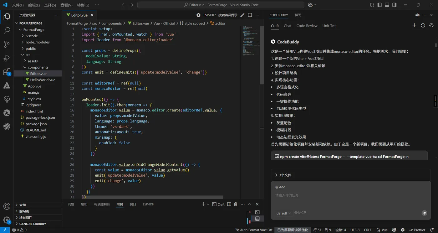它首先用 Vite 初始化了 Vue3 项目,并立即装好了我提到的 monaco-editor、@monaco-editor/loader 和 prettier。然后,它创建了主入口 App.vue 和一个叫 Editor.vue 的核心组件。我只是在旁边看着它写代码,一边生成页面结构,一边处理样式,甚至在没有我提醒的情况下,就主动配置好了模糊背景、动态边框发光的效果。