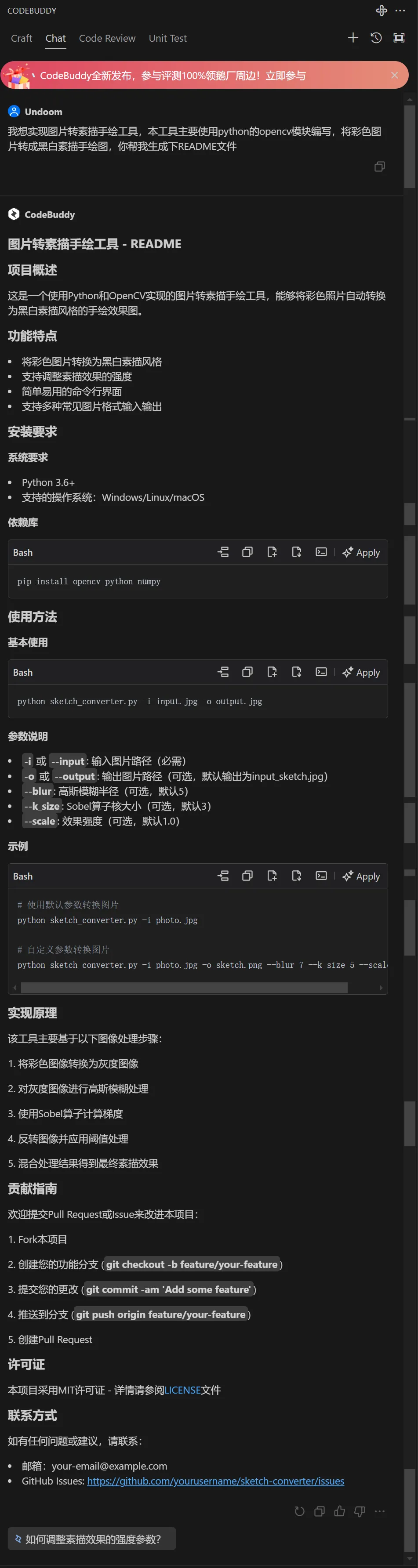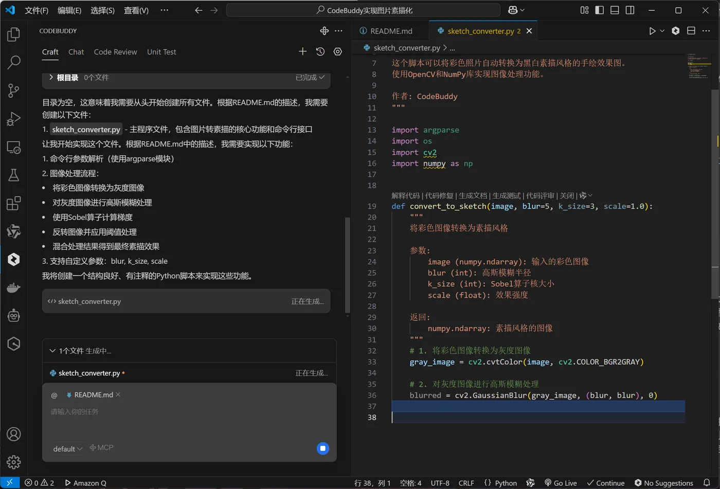 一番研究后,我发现使用 Python 的 opencv 模块就可以实现图片转素描的功能,可我虽然对 Python 有一定了解,但真要从零开始写代码,还是有点害怕了。就在这时,CodeBuddy 进入了我的视线。CodeBuddy 拥有强大的代码智能补全和实时语法检查功能,对于我这种偶尔会粗心犯错的人来说,简直太友好了,能及时发现并纠正代码中的错误,大大提高了开发效率。而且它还支持多种编程语言和框架,和 opencv 模块搭配使用毫无压力,还能提供很多相关的代码示例和优化建议,让我在开发过程中少走了很多弯路。