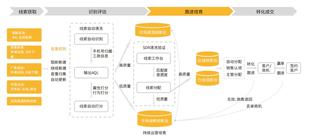 (1)能够对销售线索进行全流程、分阶段的精细管理,打造一个完整的业务链条,从线索获取、筛选评估,到分配跟进,直至成功签单,每个环节紧密相扣,从而大大提升线索转化效率。具体做法包括整合不同渠道的线索,统一管理,通过智能手段识别线索,完成清洗评估、打分、划分等级和自动分配;判断客户购买意向,对高价值线索、商机成交率、客户获取趋势等进行智能分析。