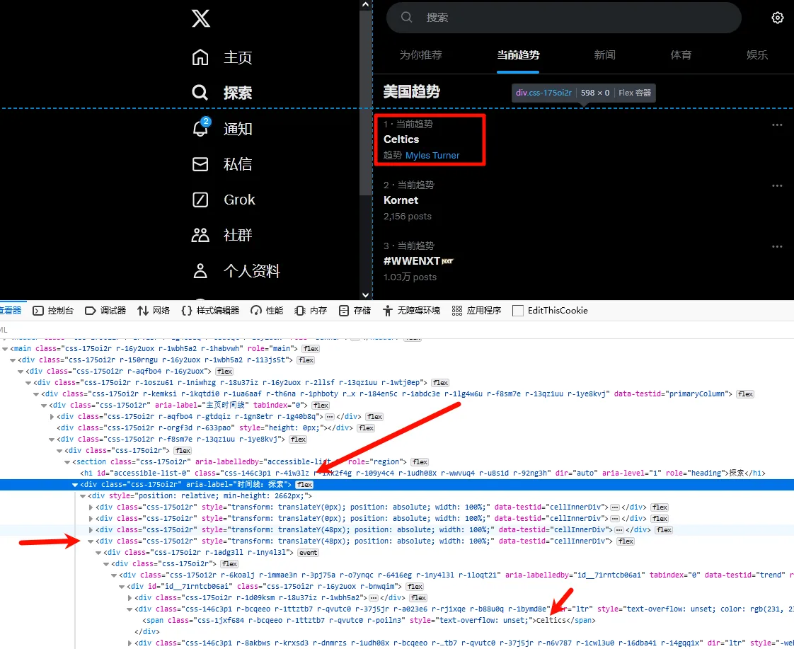 研究Twitter数据的第一步始终是搞清楚网页的结构。趋势榜单是一个容器,所有的趋势内容都嵌套在类似的HTML结构里,我们可以通过浏览器开发者工具(F12)检查页面的HTML结构。
