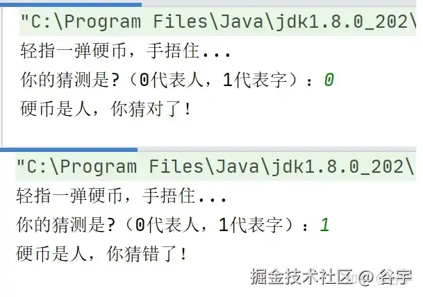 游戏规则:程序模拟抛硬币,用户猜测硬币的正反面(0代表正面,1代表反面)。程序随机生成硬币结果(0或1),用户输入猜测值,程序判断用户是否猜对并输出结果