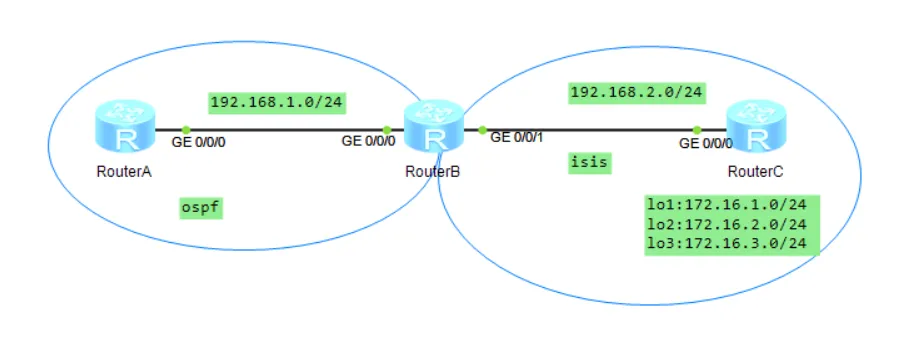 RouterB与RouterA之间通过OSPF协议交换路由信息,与RouterC之间通过IS-IS协议交换路由信息。要求在RouterB上将IS-IS网络中路由引入到OSPF网络后,OSPF网络中路由172.16.1.0/24的选路优先级较低;路由172.16.2.0/24具有标识,方便以后运用路由策略。