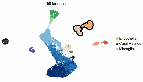 scv.pl.scatter(adata, legend_loc='right', size=60, title='diff kinetics', add_outline=diff_clusters, outline_width=(.8, .2))