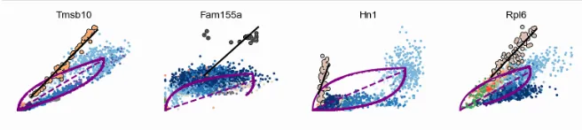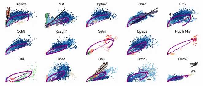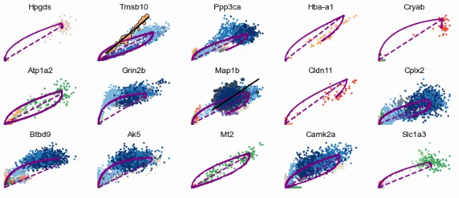 在研究过程中,一个关键问题是我们需要处理包含多个谱系和过程的系统。在这种情况下,基因在不同亚群中往往会呈现出不同的动力学特征。由于不同的细胞状态和谱系通常受到基因调控网络不同变化的影响,因此它们可能会表现出不同的剪接动力学。这就使得一些基因在相空间中呈现出多样的轨迹。