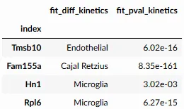 scv.get_df(adata[:, var_names], ['fit_diff_kinetics', 'fit_pval_kinetics'], precision=2)