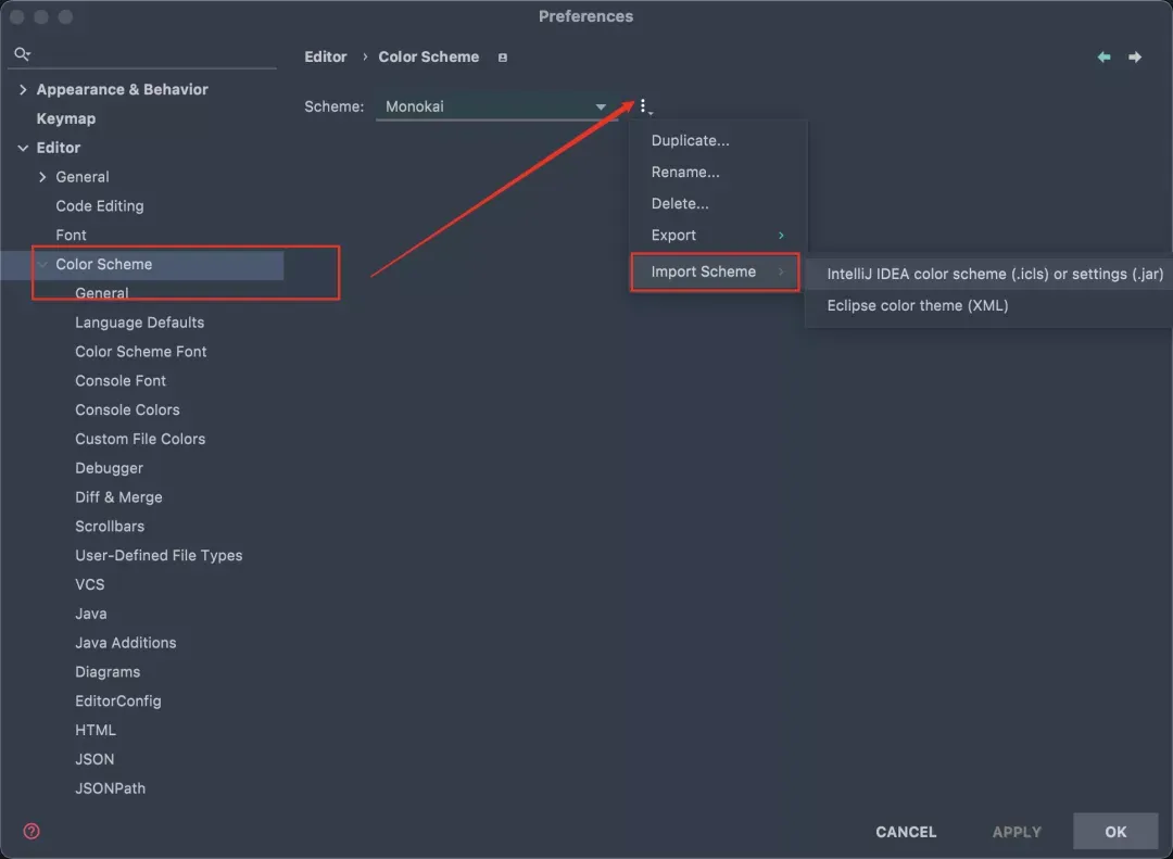将主题地址下载下来直接导入 Idea 中即可。Intellij Idea 的主题项目是 solarized 项目的衍生项目。