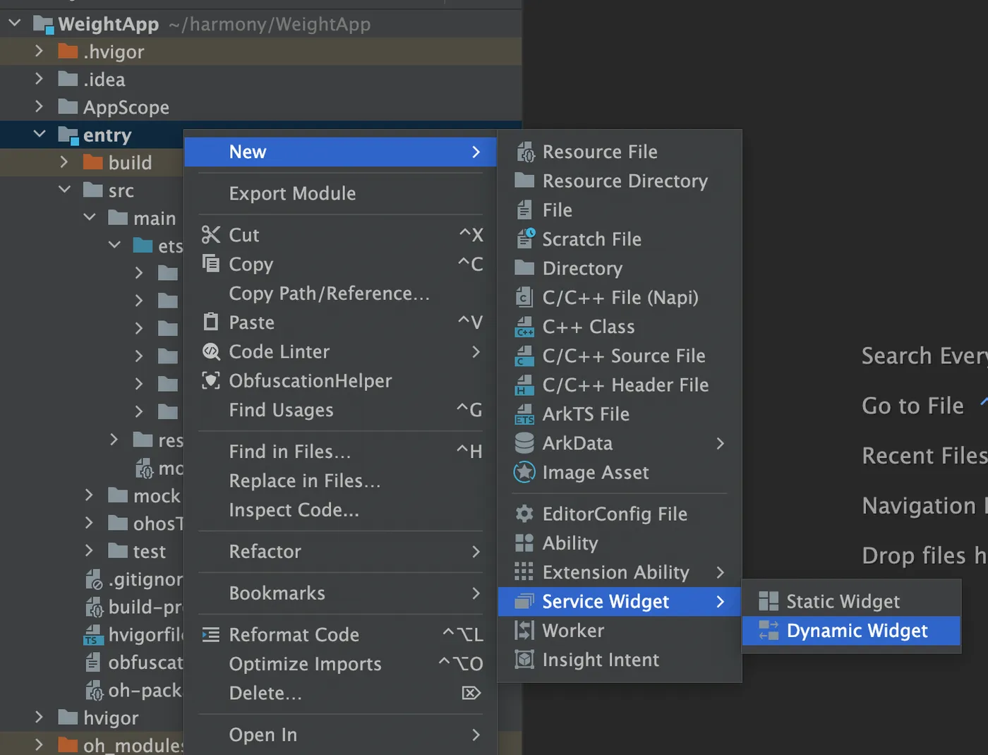 创建卡片很简单,可以在Application或者在元服务中,在你的主模块下,任意的文件下进行右键,选择New->Service Widget,选择你要实现静态或者动态卡片,这里,大家不用纠结,因为在创建完成之后,我们可以在form_config.json配置文件中,通过isDynamic参数修改卡片类型,为空或者true,则是动态卡片,false则为静态卡片,所以,在这里,你选择哪一个都没问题。