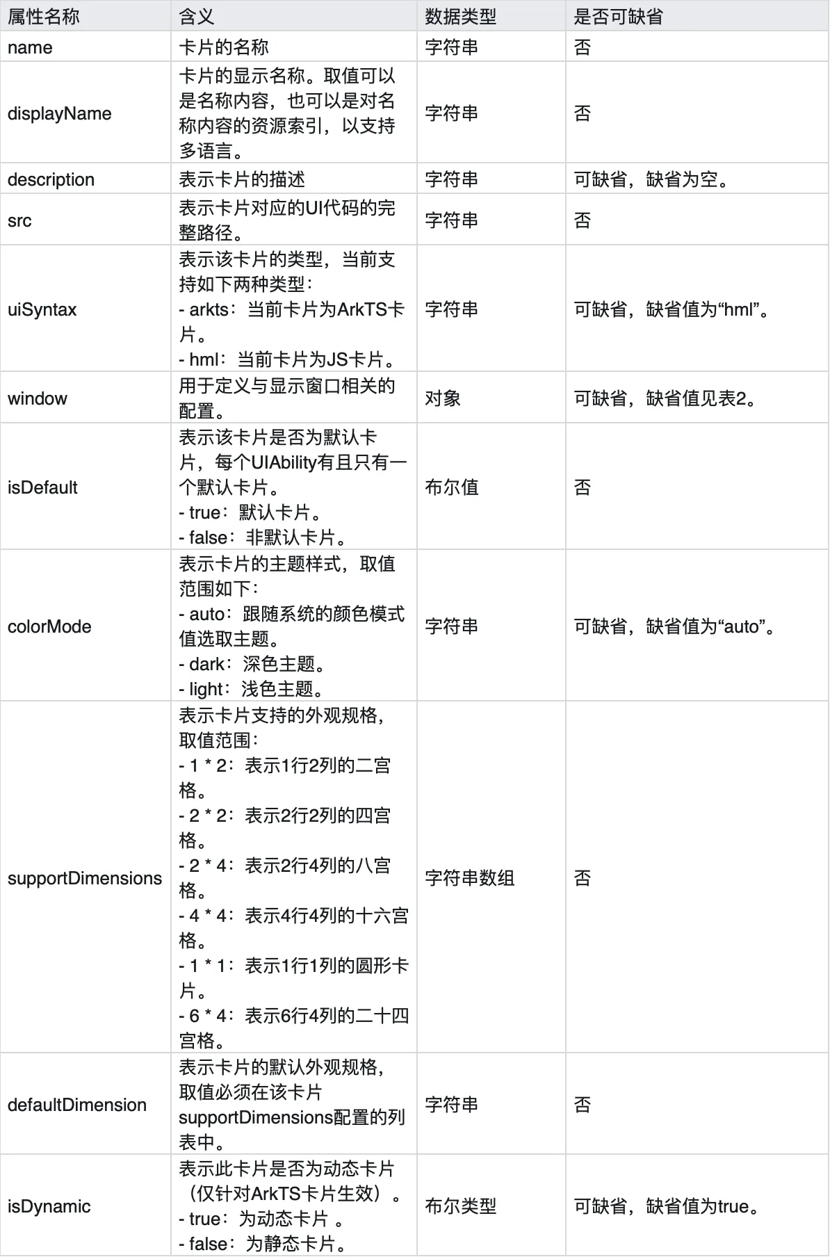 { "forms": [ { "name": "widget", "displayName": "$string:widget_display_name", "description": "$string:widget_desc", "src": "./ets/widget/pages/WidgetCard.ets", "uiSyntax": "arkts", "window": { "designWidth": 720, "autoDesignWidth": true }, "colorMode": "auto", "isDynamic": true, "isDefault": true, "updateEnabled": false, "scheduledUpdateTime": "10:30", "updateDuration": 1, "defaultDimension": "2*2", "supportDimensions": [ "2*2" ] } ] }