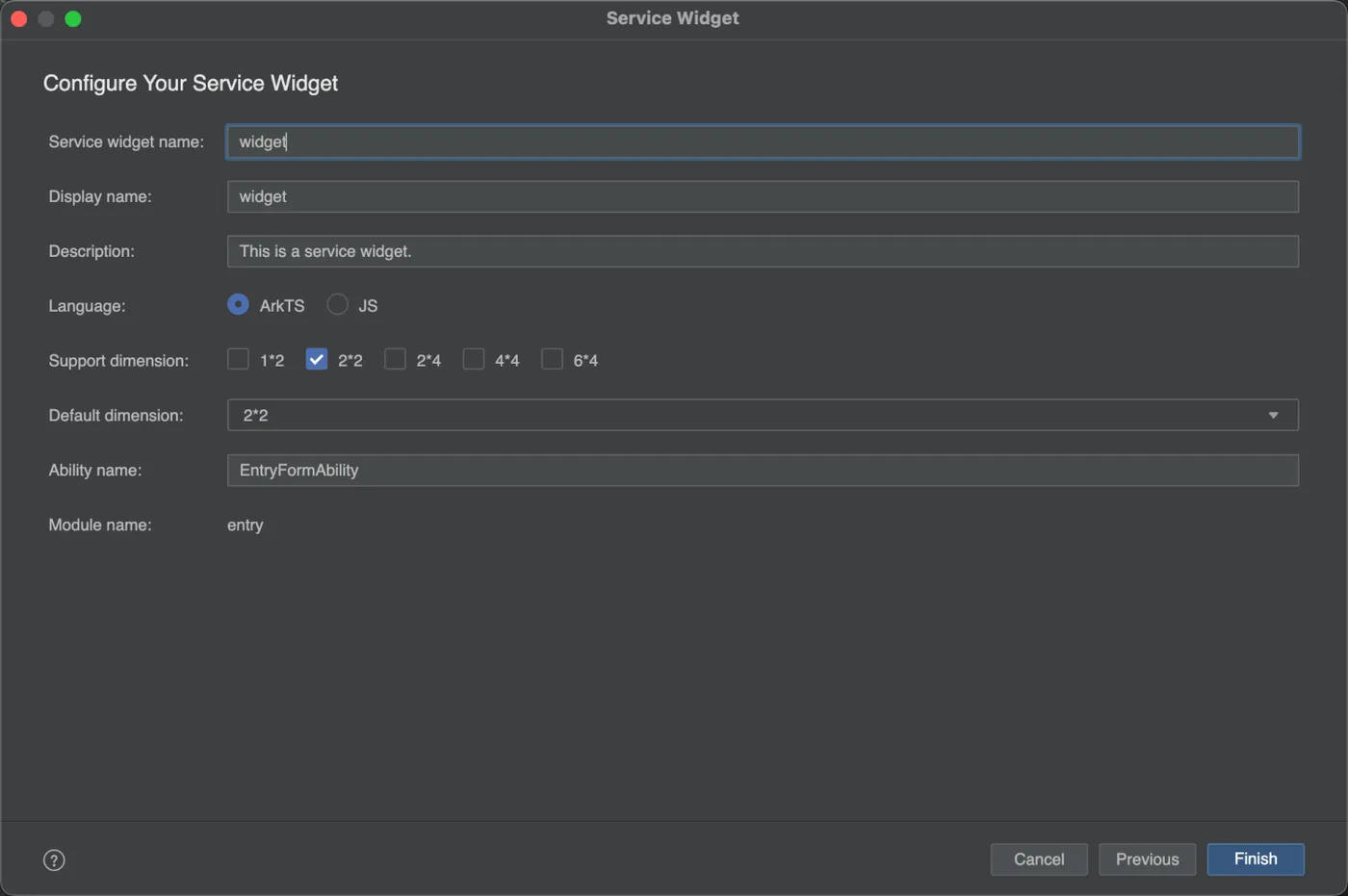 选择好一个模版之后,就进入到了如下的页面,也就是服务卡片的配置页面,从上到下分别为,Service widget name:服务卡片的名字;Display name,卡片显示的名字;description:卡片的描述信息;Language:开发语言,这里建议ArkTs;supportDimensions:卡片支持的外观规,1 * 2:表示1行2列的二宫格,以此类推;Ability name:卡片生命周期管理文件。