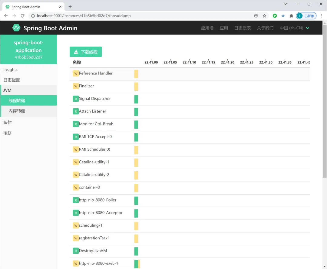 - JVM 线程转储、内存转储详情和对应的文件下载;